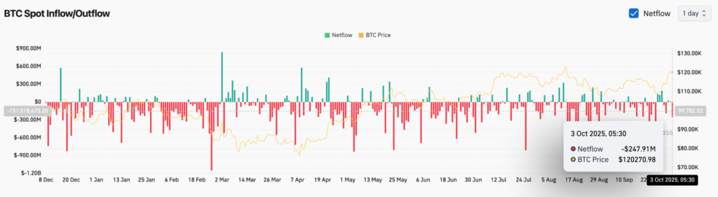 Les données on-chain montrent qu’il y a eu près de 248 millions de dollars de sorties ce jeudi, signe que les traders déplacent leurs pièces vers des portefeuilles à clé privée.