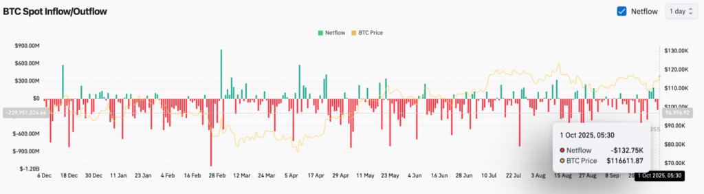Les flux au comptant sont également devenus positifs, avec 190 millions de dollars de sorties nettes le 30 septembre, les pièces s’étant déplacées des échanges vers le stockage à long terme.