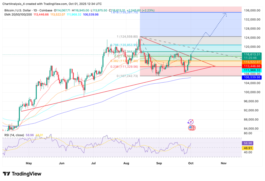 Le graphique journalier du Bitcoin montre une cassure au-dessus de la résistance du triangle descendant, avec des retracements de Fibonacci à 113 900 dollars et 116 900 dollars désormais au centre de l’attention.