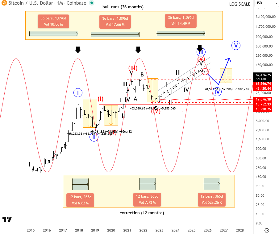Bitcoin (CRYPTO: BTC) est en train de redescendre des sommets d’octobre, et il est assez intéressant de noter que nous observons déjà un retracement aussi profond, de plus de 30 %, malgré le fait que la Fed ait abaissé ses taux ces derniers mois et que les paris en faveur d’une nouvelle baisse en décembre soient de nouveau en hausse. L’essentiel est de comprendre que les cryptomonnaies sont très sensibles aux flux d’investissement et de désinvestissement, et nous avons également observé un retracement assez profond sur les actions, mais ce qui m’inquiète le plus, c’est que même durant les journées où les actions ont progressé, le Bitcoin a toujours été vu en baisse. J’ai donc voulu prendre un peu de recul et vérifier la direction que pourrait réellement prendre le Bitcoin. Si vous regardez le graphique mensuel, vous pouvez clairement voir que chaque phase haussière a duré environ 36 mois, soit exactement 3 ans, et ce cycle s’est également achevé en octobre, moment à partir duquel un retournement très intéressant a commencé. Ce qui est également important du point de vue du cycle, c’est que les corrections durent généralement environ 12 mois, et sur cette base il semble que la nouvelle correction de degré supérieur pourrait être arrivée et qu’elle est certainement pas encore terminée.