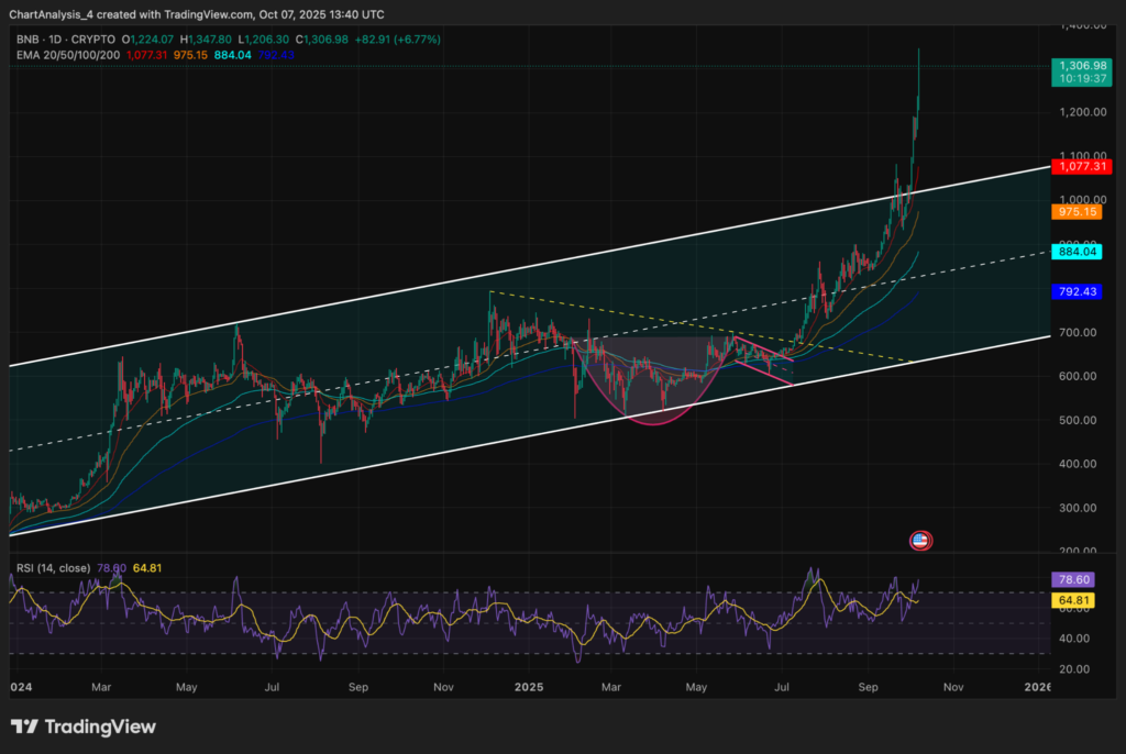 Analyse technique : D’un point de vue technique, BNB est sorti d’un canal ascendant à long terme, avec une résistance franchie près des 1 200 dollars et une accélération nette à la hausse.