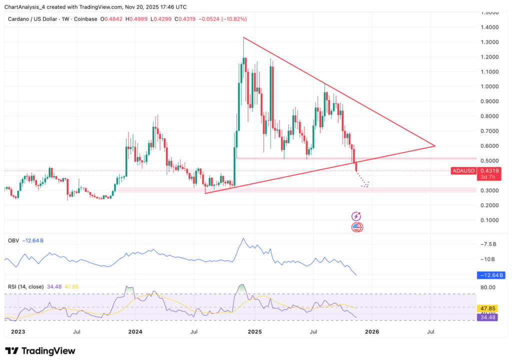 ADA a perdu son ancrage final de plus bas à environ 0,48 $ et a glissé dans la bande de demande médiane des 0,30 $, en phase avec les niveaux de pivot du cycle antérieurs.