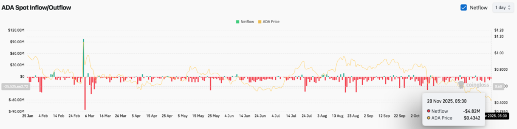 Les données de Coinglass indiquent que l’ADA a enregistré 4,82 millions de dollars de sorties nettes le 20 novembre, ce qui constitue le quatrième chiffre négatif consécutif.