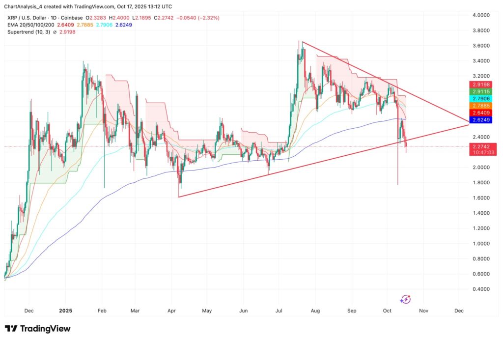 Après être tombé à 2,18 $, l’XRP a rebondi à 2,27 $, maintenant ainsi sa ligne de tendance ascendante à long terme.