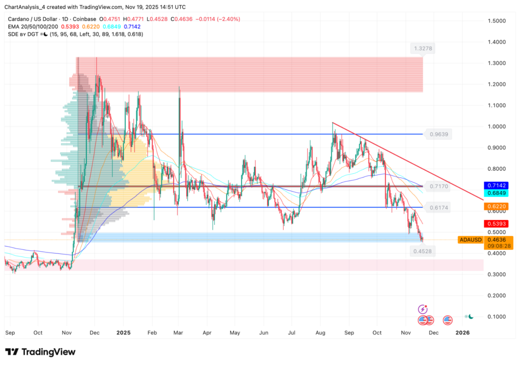 Cardano se négocie juste au-dessus de la zone de demande dense comprise entre 0,45 et 0,43 dollars, un niveau qui a historiquement servi de région d’accumulation.