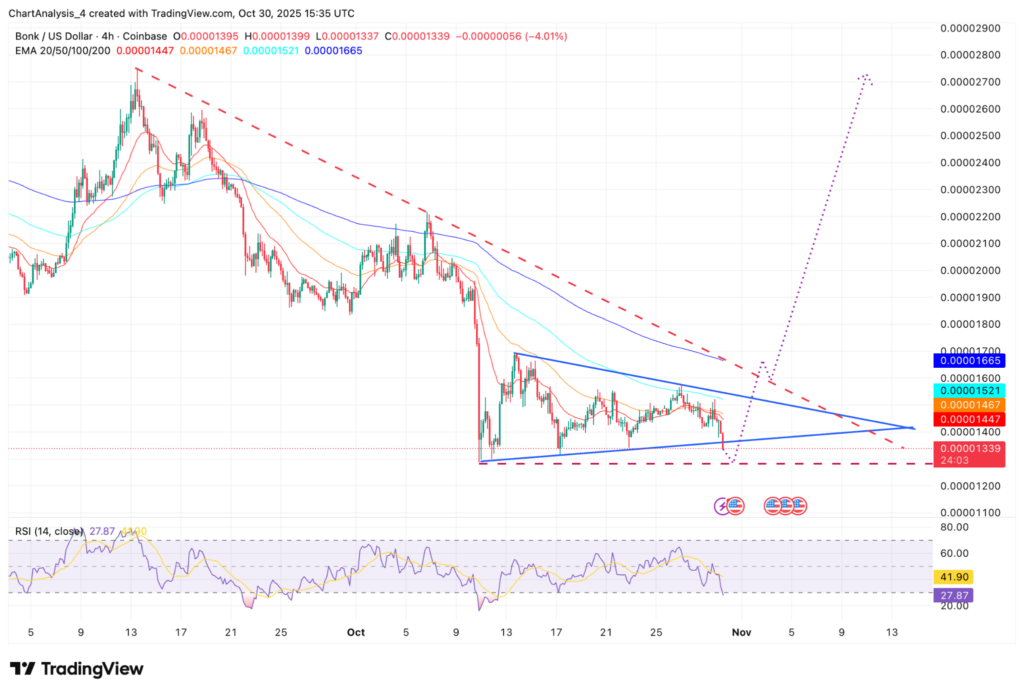 Bonk (CRYPTO: BONK) se négocie autour de 0,0000134 dollars après avoir défendu un support critique, les graphiques signalant la formation d’une configuration potentielle de rupture.