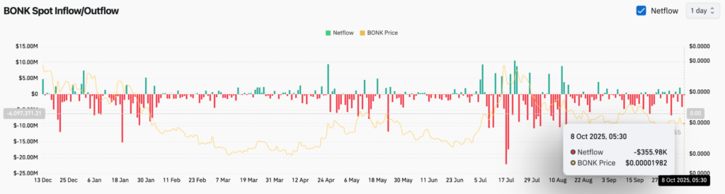 Selon les données de Coinglass, BONK a vu 355 000 dollars de sorties d’échanges le 8 octobre, marquant une continuation des flux nets négatifs.