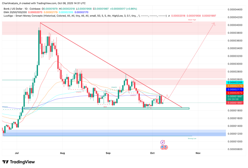 Le graphique journalier révèle que BONK appuie sur une ligne de tendance descendante à long terme près de 0,000022 dollars, avec plusieurs retests infructueux depuis juillet.