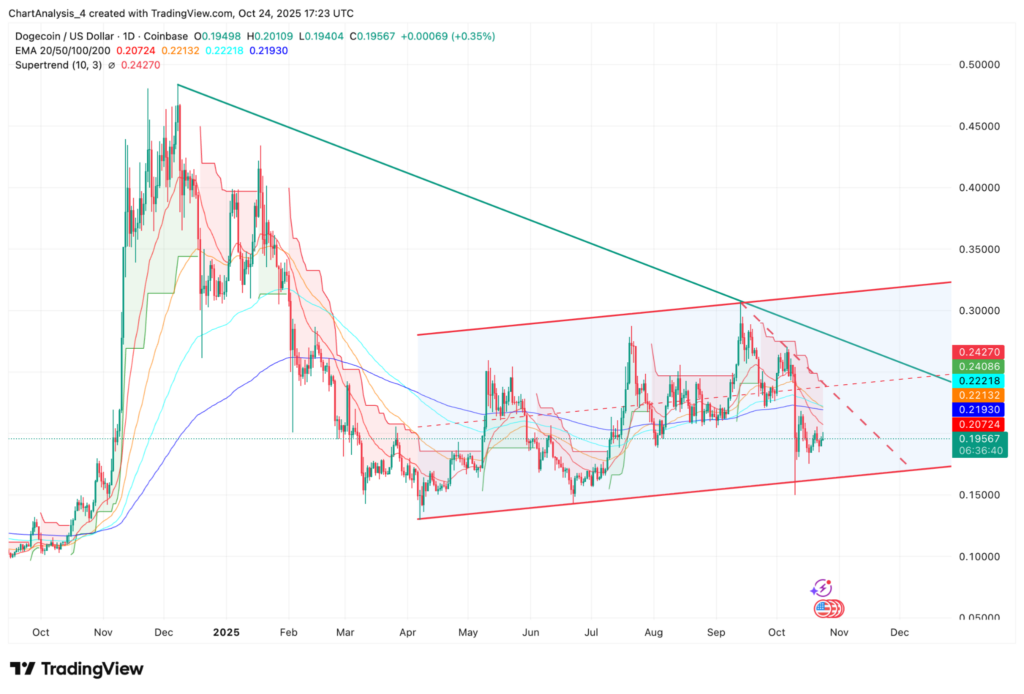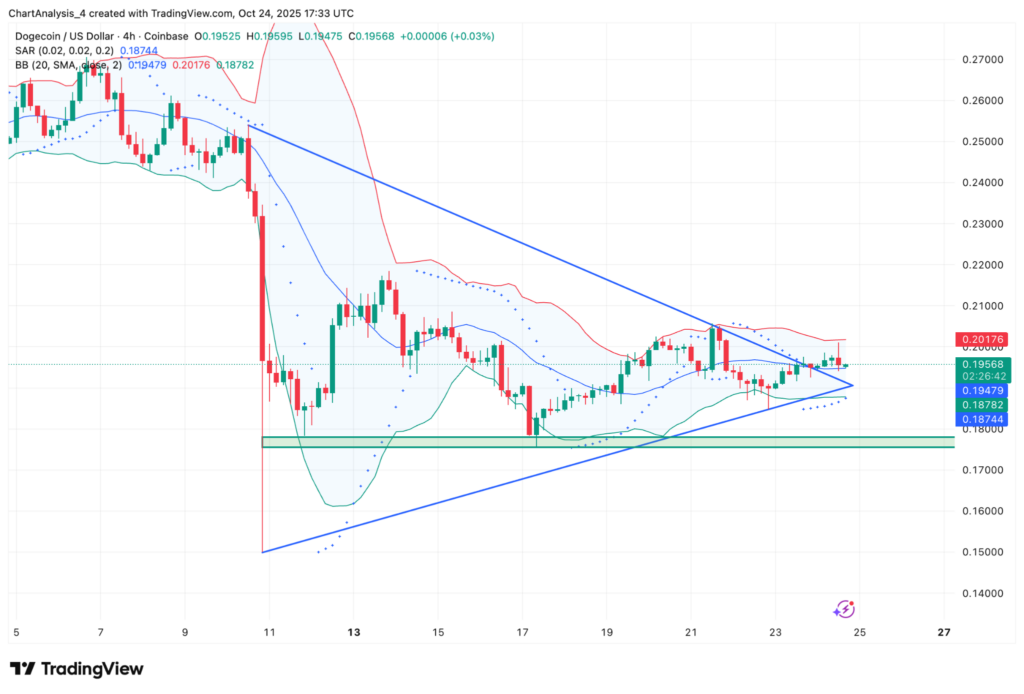 Le Dogecoin (CRYPTO: DOGE) se consolide autour de 0,195 $ après avoir échoué à maintenir ses gains au-dessus de 0,30 $ plus tôt en octobre, les graphiques techniques signalant qu’une cassure pourrait être imminente.
