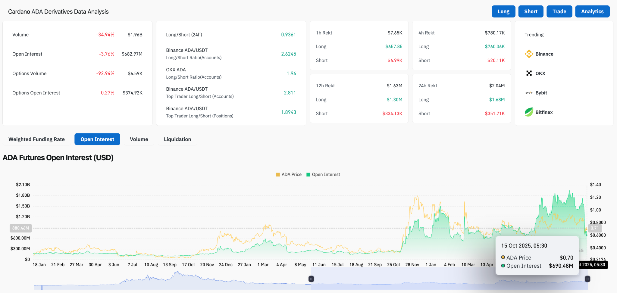 L’activité sur les dérivés a fortement diminué. Le volume des contrats à terme ADA est en baisse de 34,9 % sur la journée, et l’intérêt ouvert a chuté de 3,7 % pour s’établir à 682 millions de dollars.