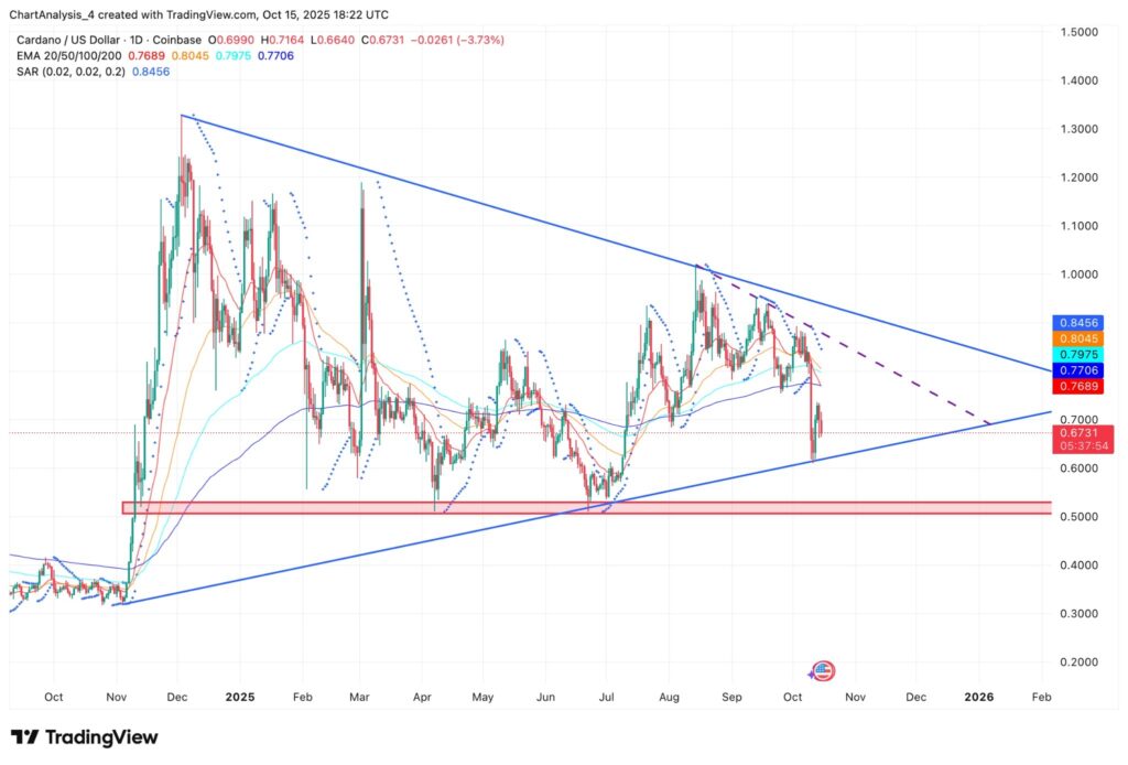 Le token se négocie autour de 0,67 dollar au 15 octobre, après avoir glissé vers la limite inférieure d’un triangle symétrique à long terme.