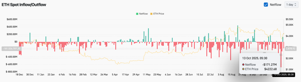 Les données sur les flux nets d’échanges indiquent 171 millions de dollars de sorties de fonds le 13 octobre, selon Coinglass, alors que l’ETH s’échangeait autour de 4 222 dollars.