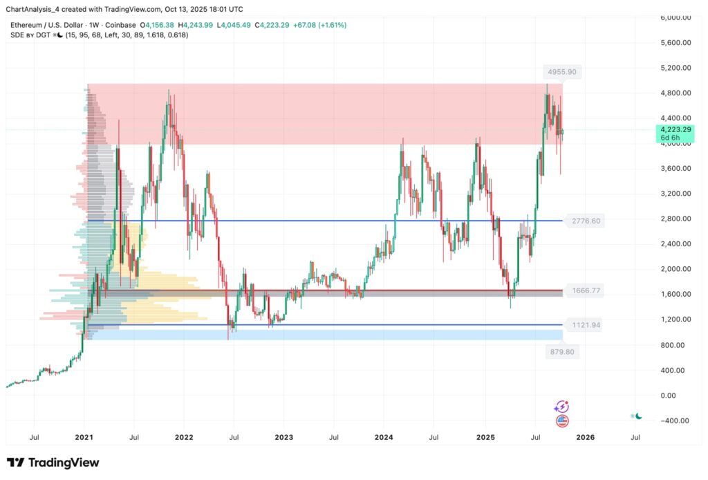 La lutte d’Ethereum dans la bande des 4 750-5 000 dollars est plus qu’un test technique, c’est la même zone qui a rejeté toutes les tentatives de breakout depuis 2021.