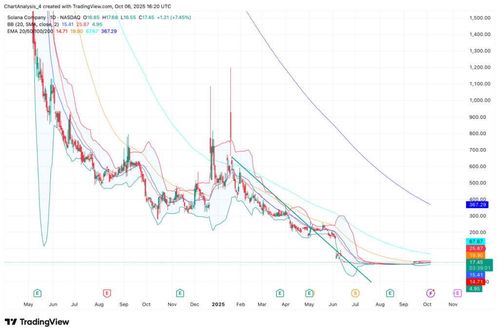 Les actions de Solana Company ont tenté de se stabiliser après une longue tendance à la baisse. Le titre a rebondi par rapport aux creux de l’été et se consolide désormais autour de 17 dollars.