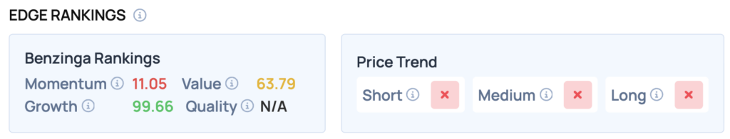 Classements de Benzinga Edge : Les classements de Benzinga Edge illustrent davantage ce profil contrasté, mettant en évidence un score de Croissance presque parfait de 99,66, qui contraste fortement avec une note de Momentum faible de 11,05.