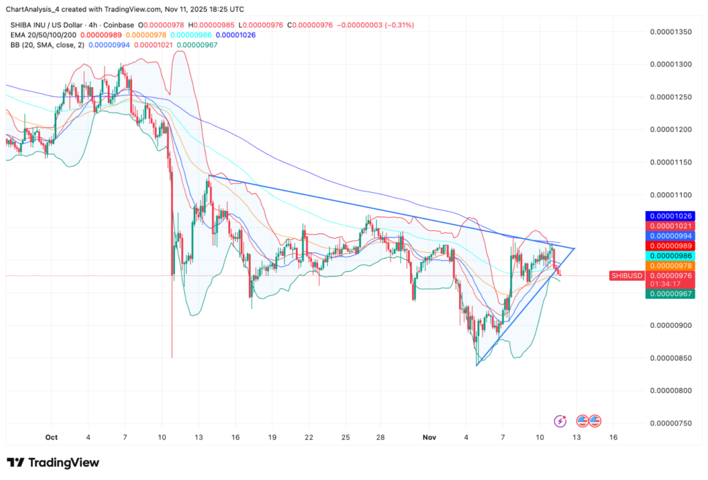 SHIB se négocie autour de 0,00000976 $, retombant sous le triangle et les EMA à court terme après la tentative avortée d’évasion.