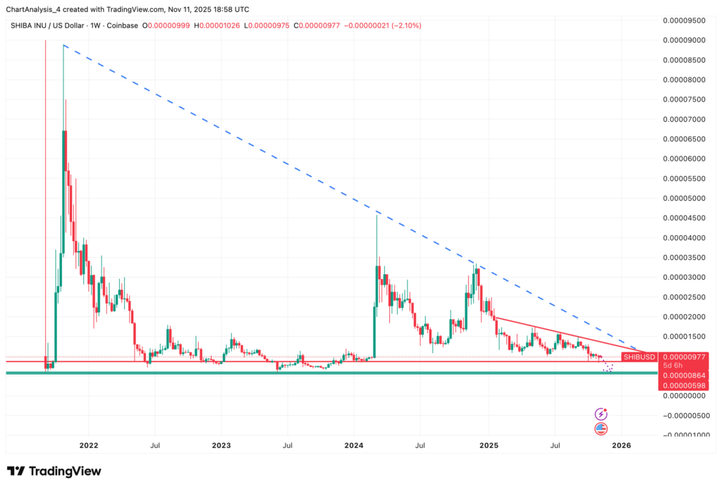 Sur le graphique hebdomadaire, SHIB se négocie près de 0,00000975 $ à 0,00000980 $, restant enfoncé sous une ligne de tendance descendante qui a rejeté toute tentative d’évasion depuis octobre 2021.
