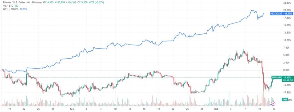 Lorsque le président Trump a annoncé l’imposition de tarifs douaniers importants sur les importations chinoises, nous avons assisté à un événement fascinant en temps réel. Le Bitcoin a chuté de 15 % par rapport à son récent sommet, à près de 126 000 dollars. Pendant ce temps, l’or (qui venait de franchir le cap des 4 000 dollars l’once) est resté stable et a même attiré des flux vers des valeurs refuges.