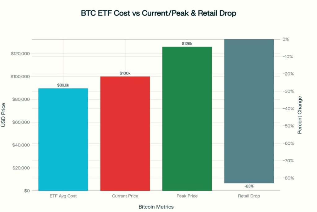 La base de coût ETF de Bitcoin (89 613 $) par rapport au prix actuel (100 000 $) et au sommet (126 000 $), ainsi que l’effondrement de 83 % des dépôts retail Binance (de 552 à 92 BTC/jour), révèlent un risque concentré et un soutien retail en voie de disparition.