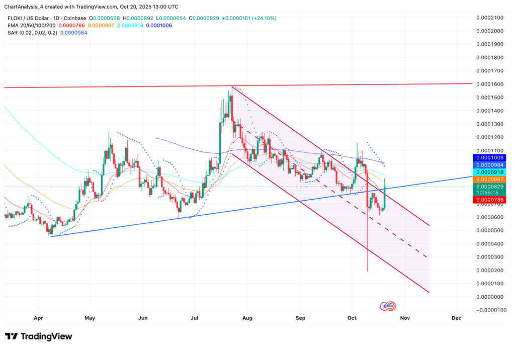 Le graphique journalier de Floki montre une nette cassure de son canal descendant de deux mois, le prix grimpant au-dessus de la moyenne mobile exponentielle (MME) à 20 jours à 0,0000786 $.