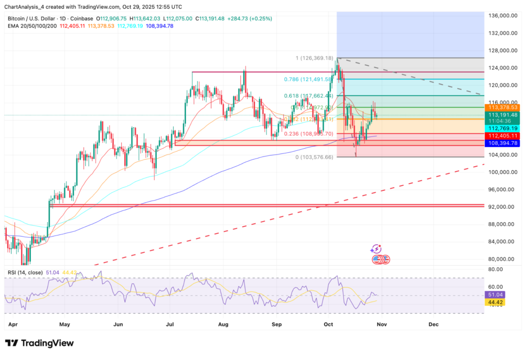 Le graphique journalier montre le prix du BTC reprenant la moyenne mobile exponentielle (EMA) sur 20 jours à 112 405 dollars et planant près de l’EMA sur 50 jours à 113 378 dollars.
