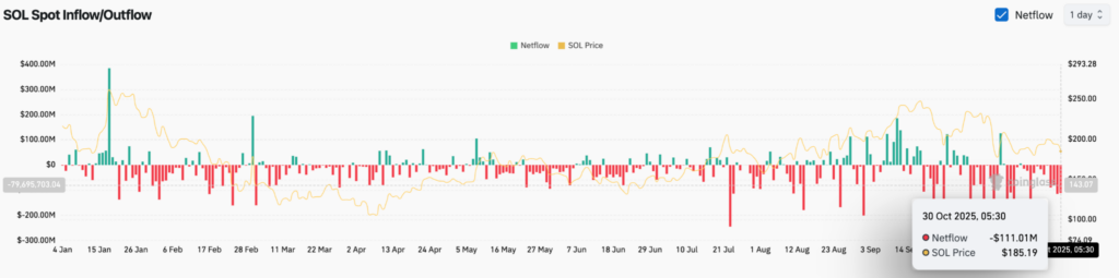 Les données révèlent plus de 400 millions de dollars en sorties au comptant de Solana au cours des quatre derniers jours, dont 111 millions de dollars le 30 octobre seulement.