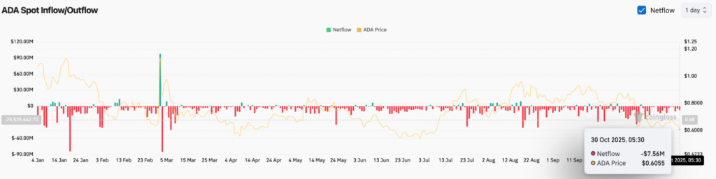 Les données on-chain indiquent 7,5 millions de dollars en sorties d’ADA le 30 octobre, ce qui prolonge un schéma de pression de vente soutenue observé ce mois-ci.
