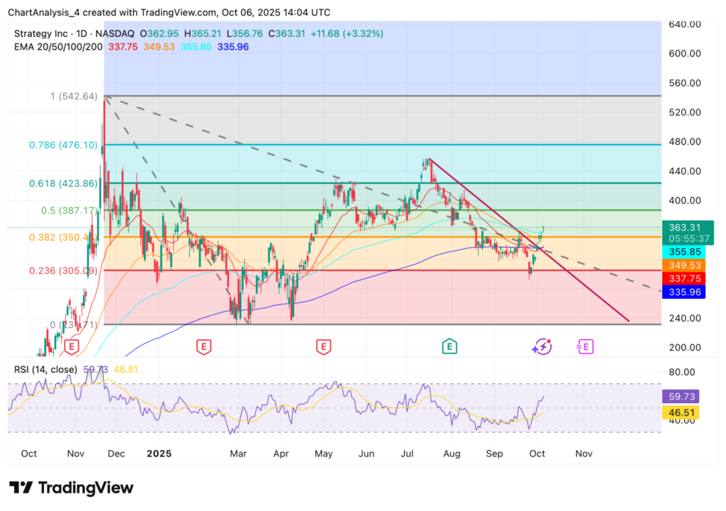 Strategy Inc. (NASDAQ:MSTR) est en hausse de 2 % ce lundi après avoir annoncé un gain de 3,9 milliards de dollars sur ses avoirs en Bitcoin (CRYPTO : BTC) au troisième trimestre et après avoir brisé une tendance baissière technique clé.