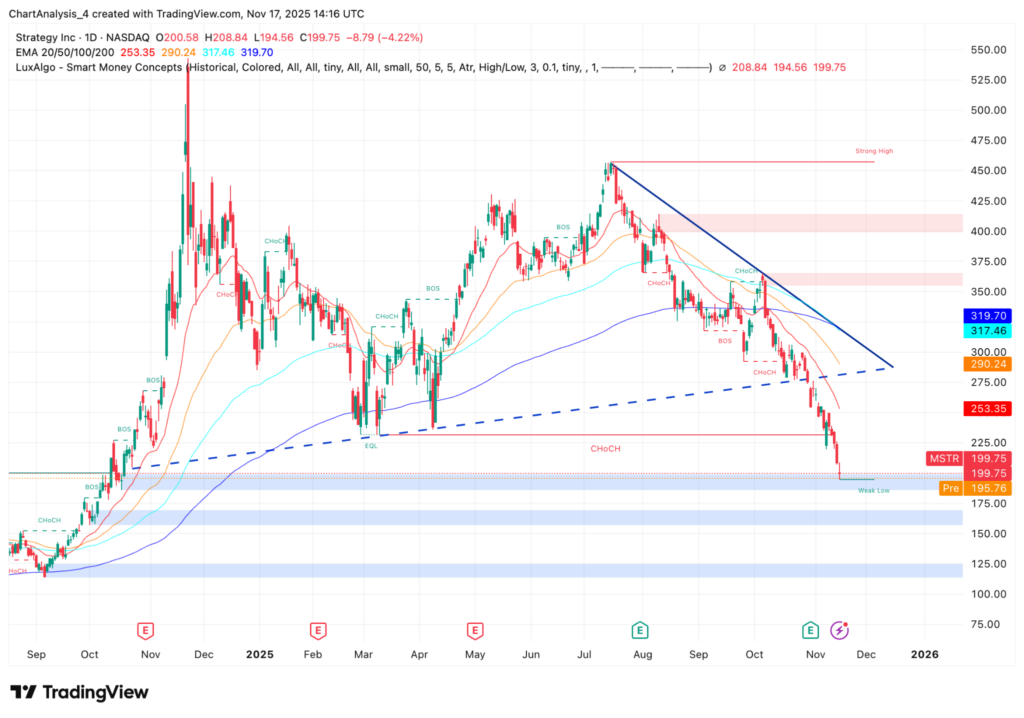 L’action a étendu sa baisse de novembre et se négocie désormais près de 200 dollars après avoir franchi plusieurs niveaux de support majeurs qui ont maintenu la structure 2024-2025.