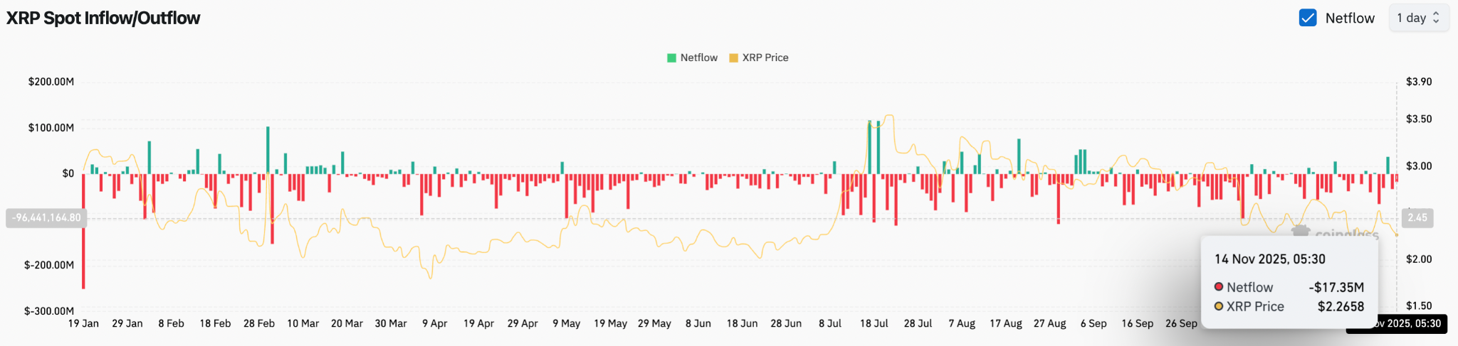 Les flux nets au comptant ont enregistré une sortie de 17,35 millions de dollars le 14 novembre, marquant une autre session dominée par la vente.