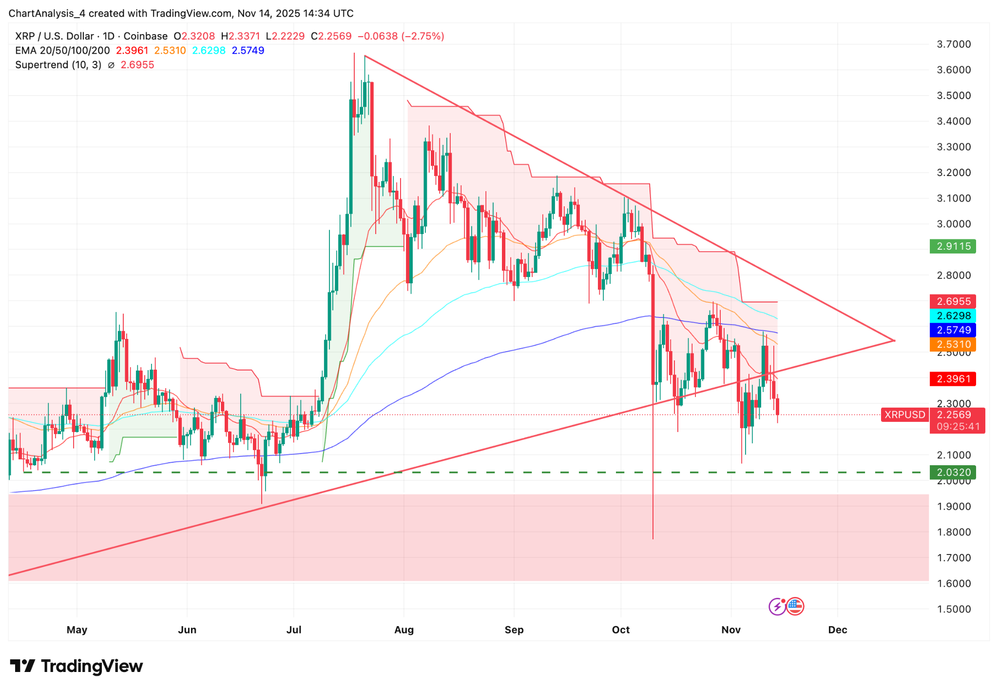 XRP se négocie à environ 2,25 dollars après qu’une pression à la vente persistante a pesé sur la structure triangulaire d’un mois.