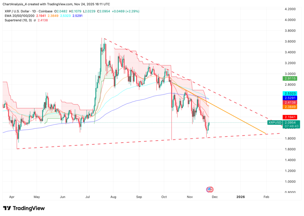 Pour que les acheteurs reprennent leur élan, l’XRP doit d’abord retrouver 2,19 dollars, puis clôturer au-dessus de la ligne de tendance descendante près de 2,4 dollars.