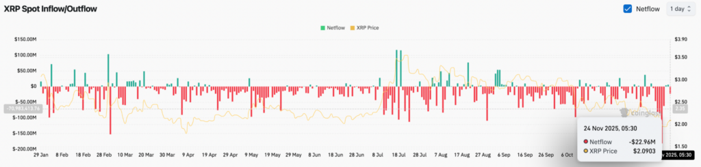 Les données de Coinglass montrent 22,96 millions de dollars de sorties nettes XRP le 24 novembre, ce qui prolonge des mois de flux négatifs.