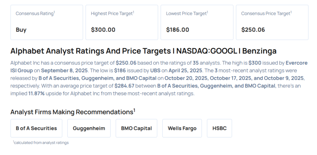 - BofA Securities a relevé l’objectif de prix d’Alphabet Inc. (NASDAQ:GOOGL) de 252 $ à 280 $. L’analyste de BofA Securities, Justin Post, a maintenu une note d’achat. Vendredi, les titres d’Alphabet se sont clôturés à 253,30 $. Découvrez l’opinion des autres analystes sur ce titre.