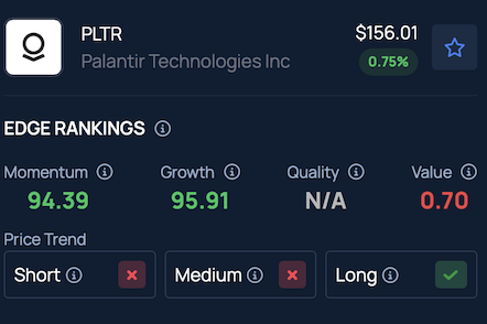 Palantir se situe dans le 95e centile en matière de croissance et dans le 94e centile en matière de momentum dans le classement des actions Edge de Benzinga — cliquez ici pour le comparer avec d’autres actions.
