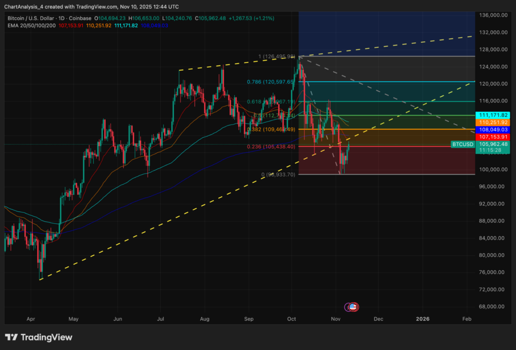 Le Bitcoin se négocie juste au-dessus des 105 400 dollars, soit le retracement de Fibonacci 0,236, qui a à plusieurs reprises servi de première ligne de défense lors de cette correction.