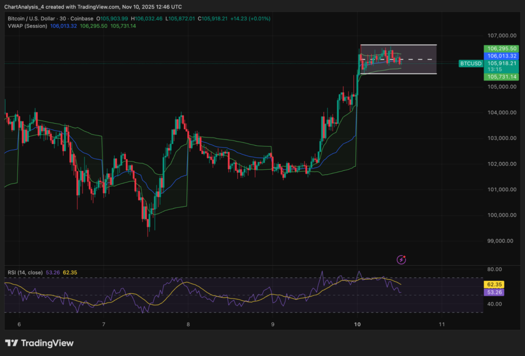 Les graphiques intrajournaliers montrent le Bitcoin dans une fourchette étroite entre 105 700 et 106 300 dollars, ce qui indique une consolidation après un rebond à court terme.