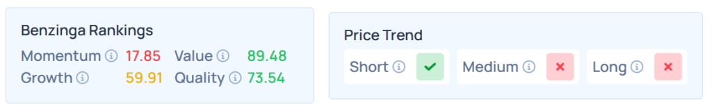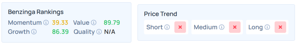 Selon les descriptions de Benzinga Edge Stock Ranking, le score de valeur est une mesure composite classée par percentile comparant le prix de marché d’une action à ses fondamentaux financiers tels que les actifs, les ventes, les bénéfices et les performances d’exploitation.