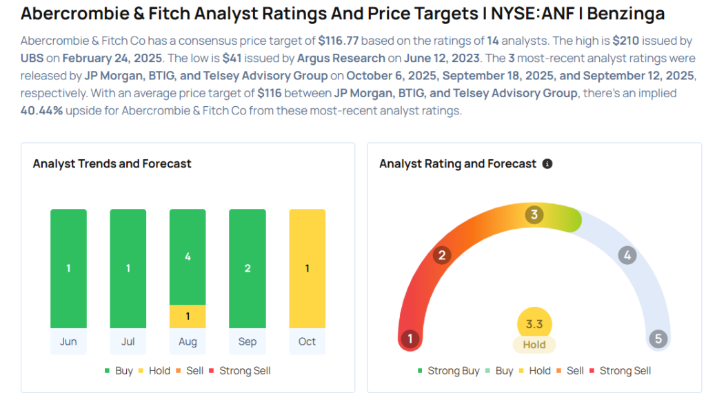 - Matthew Boss, analyste chez JP Morgan, a dégradé Abercrombie & Fitch Co. (NYSE:ANF) de Overweight à Neutral et a annoncé un objectif de prix de 103 dollars. Les actions d’Abercrombie & Fitch se sont clôturées à 84,48 dollars vendredi. Découvrez le point de vue des autres analystes sur ce titre.