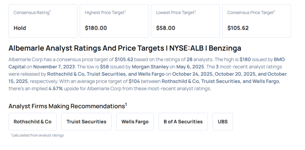 - L’analyste de Rothschild & Co, Mazahir Mammadli, a initié la couverture d’Albemarle Corporation (NYSE:ALB) avec une recommandation Buy et un objectif de prix de 135 dollars. Jeudi, Albemarle a clôturé à 97,36 dollars. Découvrez le point de vue d’autres analystes sur ce titre.