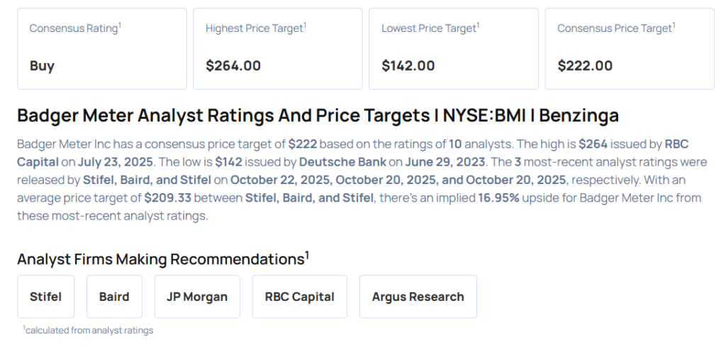 - Nathan Jones, analyste chez Stifel, a relevé la note de Badger Meter Inc (NYSE:BMI) de Hold à Buy et a augmenté l’objectif de cours de 208 à 215 $. Badger Meter s’est clôturé à 177,35 $ mardi. Découvrez le point de vue des autres analystes sur ce titre.
