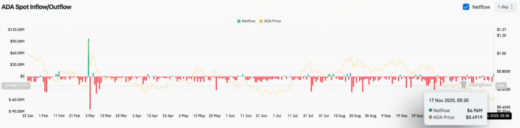 Les données de Coinglass indiquent un flux entrant de 6,96 millions de dollars au cours de la session la plus récente, lorsque l’ADA s’échangeait près de 0,4919 dollar.