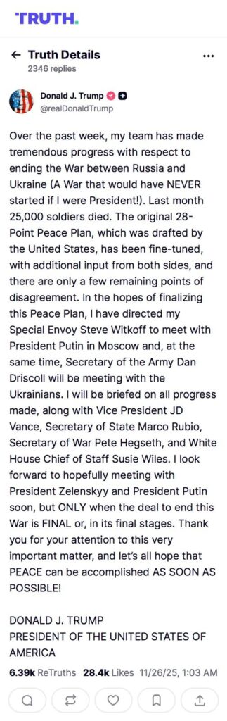 Samedi, Trump avait clarifié que son plan de paix initial n’était pas la « dernière offre ». Tard mardi, Trump a posté sur Truth Social que le plan original a été « affiné » avec des contributions de la Russie et de l’Ukraine, avec « seulement quelques points de désaccord restants ».