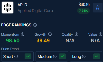 Les Edge Stock Rankings de Benzinga soulignent le fait qu’APLD a du momentum au 98e percentile. Suivez la performance des autres acteurs de ce segment.