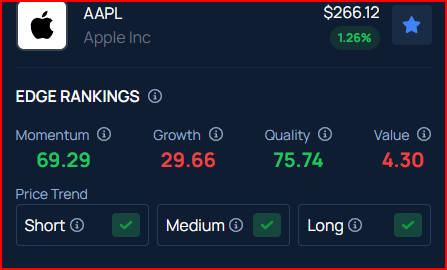 Les classements Edge de Benzinga placent Apple au 76e percentile pour la qualité et au 69e percentile pour la valeur, reflétant sa solide performance dans les deux domaines. Consultez le rapport détaillé ici.