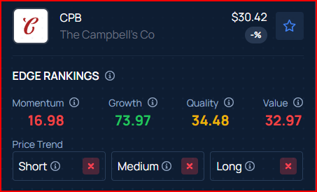 Les classements Edge de Benzinga placent Campbell Soup au 73e centile pour la croissance et au 34e centile pour la qualité, ce qui reflète une performance moyenne. Consultez le rapport complet ici.