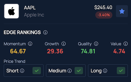 Les classements de titres Edge de Benzinga placent la qualité du titre Apple au 74e percentile, ce qui souligne sa positionnement solide par rapport à ses pairs et à d’autres concurrents.