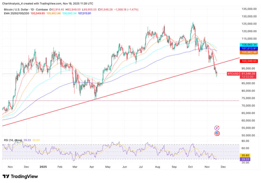 Le Bitcoin se situe en dessous de sa ligne de tendance ascendante de l’année et reste en dessous de toutes les moyennes mobiles principales.
