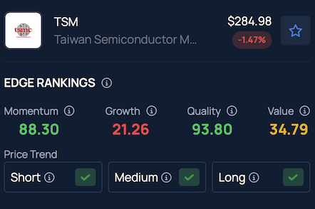 TSMC a clôturé à 286,50 $ vendredi, en baisse de 0,94 %, tandis que son cours après la clôture a augmenté de 0,72 % à 288,57 $. Les classements Edge Stock de Benzinga montrent que TSMC maintient une trajectoire solide à la hausse sur les horizons temporels à court, moyen et long terme. Cliquez ici pour une comparaison approfondie avec ses concurrents.