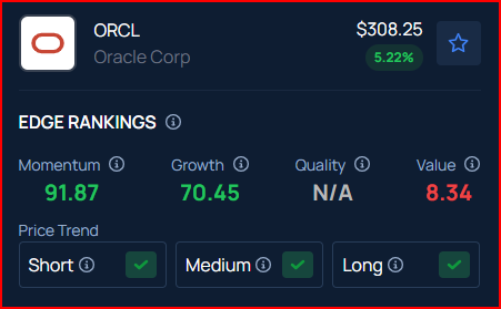 Les classements Edge de Benzinga placent Oracle au 92e centile pour l’élan et au 70e centile pour la croissance, ce qui reflète ses solides performances dans les deux domaines. Consultez le rapport détaillé ici.